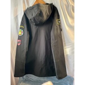 This is the Neff Forves Jacket, a men's softshell jacket with a military-inspired design. The jacket features several patches, including "Neff Forces," "Hellcats," and "Create & Destroy". It is made from a polyester/spandex blend, making it wind and water-resistant.