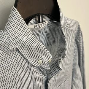 This is a great piece from Neil Barrett, made in Italy size 16 neck/41 slim fit. This will work for you if you wear a medium slim fit. Or a small and want a looser fit. Blue and white dot pattern. Signature Neil Barrett two stripes at the back. Great colors, close to zero wear.