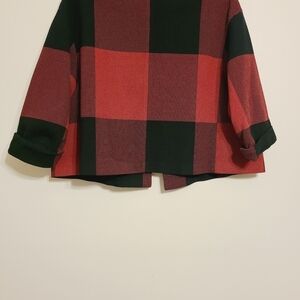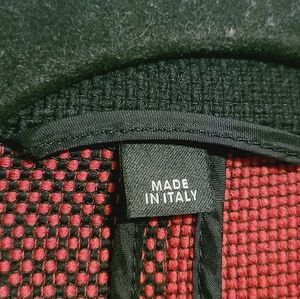 Stylish women's jacket featuring a bold red and black plaid design by Neil Barrett. Perfect for adding a touch of elegance to any outfit. Jacket has a two button closure, front pockets, and inside pockets. Cuffs on arms.