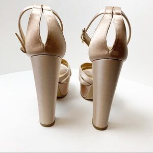 In good condition with some damage to the satin on the side as shown. Blush color satin with chunky block heel Heel height 5.25” platform is 1.5”