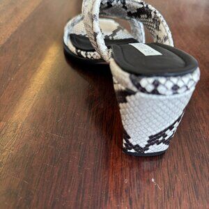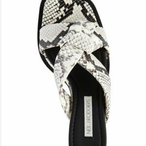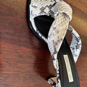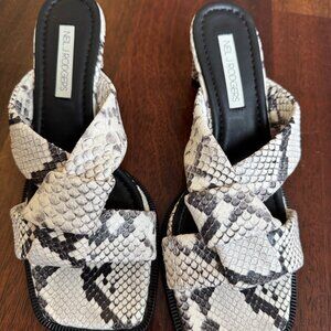 New in box, never worn. Fits true to size (8.5), extremely comfortable. Leather printed with snakeskin print in black and white