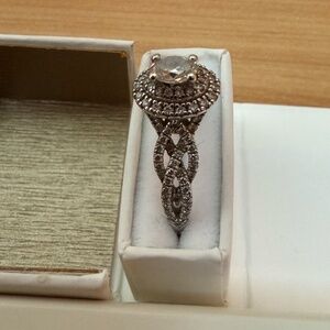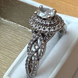 Oval cut diamond double halo braided shank engagement ring 3/4 ct 14k white gold.