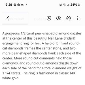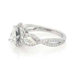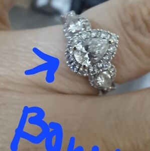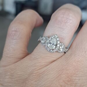 Neil Lane 1.25ctw white gold ring. 3 pear shape diamonds that are haloed by round diamonds. Neil Lane and 14k stamped on inside of ring. Ext care plan purchased. In 6th picture it shows the "bowtie" in diamond that signifies it is a well cut clear diamond. Stunning!!! Size 4.5. Can be resized for free at Kay's. Comes from Kay Jewelers.