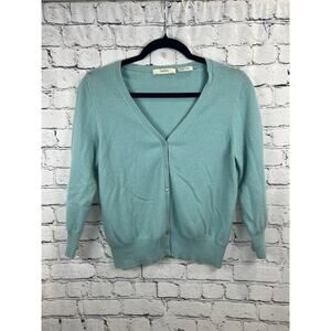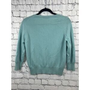 100% cashmere sweater, soft cashmere knit, luxury designer sweater, mint green cardigan, V-neck button up, premium women’s knitwear, cozy soft layering piece, classic minimalist style, transitional wardrobe staple, cashmere gift idea, gently worn designer
