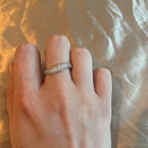 Give your style a playful spin with our cubic zirconia wavy eternity ring. With 95 premium AAAAA cubic zirconia stones, each 1mm in size, this ring shimmers with every turn. Its 5mm width makes a bold statement, striking the perfect balance between elegant and contemporary. The distinctive wavy design allows for easy stacking, perfect for pairing with your go-to rings.