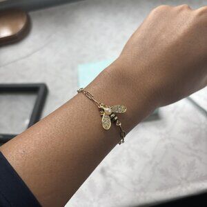 This exquisite bracelet features a delicate 18K gold-plated cable chain adorned with a cute bumble bee charm, a lustrous oval pearl, and sparkling cubic zirconia accents. Its playful yet elegant design captures the spirit of nature while adding a luxurious touch to any outfit.