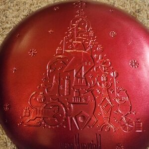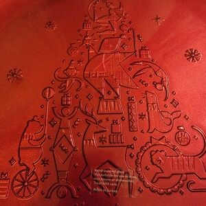Neiman Marcus 2019 hand-painted red glass Christmas platter. It is 13 inches in diameter and features a Christmas tree design with various holiday-themed images.