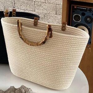 Neiman Marcus Beige Resin Bamboo Handle Cotton Thread Tote Bag