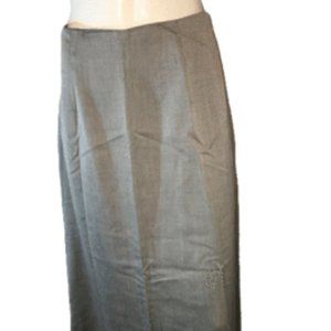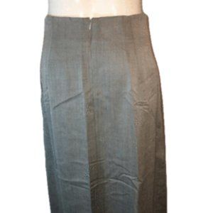 DESCRIPTION: Black and white hounds tooth ankle length skirt with back zipper closure. Below knee length skirt 100% cotton in tan with brown decorative stitching and belt loops.