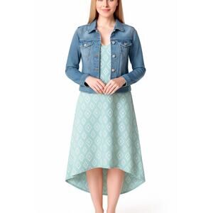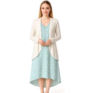 Elegant Neiman Marcus high-low dress in a soft blue geometric print. Crafted from 100% Tencel, this