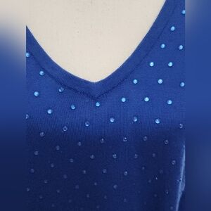 This elegant blue tunic from Neiman Marcus features long sleeves and a fitted silhouette, adorned with subtle embellishments for a touch of sophistication. The soft fabric and classic design make it a versatile addition to any wardrobe. There are a few stones missing that are unnoticeable.