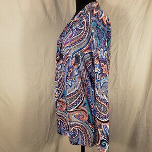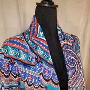 Elevate your style with this vibrant Neiman Marcus Cashmere Collection paisley print cardigan. The eye-catching design features a rich blend of blues, oranges, and purples, accented with black. Its lightweight fabric make it a versatile accessory, perfect for adding a pop of color and personality to any outfit. Whether worn with a skirt or trousers, or jeans for a weekend excursion, this cashmere silk wool blend cardigan is sure to turn heads and express your unique fashion sense.