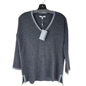Soft 100% cashmere sweater offering a luxurious feel. Features a stylish V-neckline with white trim detail and side slits for added comfort.