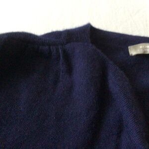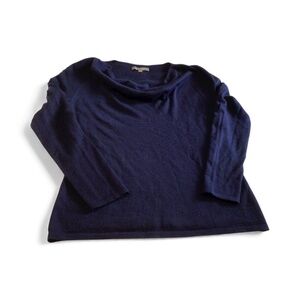 Elegant deep blue sweater with a cozy draped front created by gathering at the shoulder. Perfect for layering. Double layer front. Dry clean. 19 PTP waist 16 Length 24.5 approx