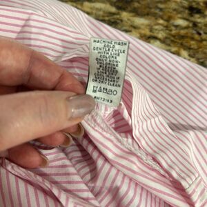 This is a sleeveless, pink and white striped tunic top with a relaxed fit. It features a notch neckline with a partial button-down front and a unique tie-front detail at the waist, giving it a stylish and playful look. The hemline is asymmetrical, adding extra flair to the design.
