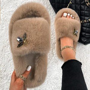 Neiman Marcus Designer Bee Decor Faux Fur Luxury Slippers