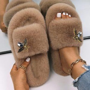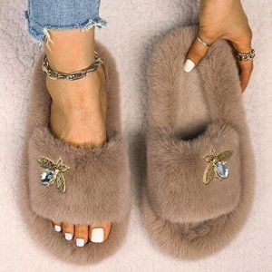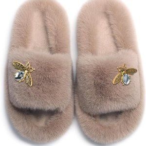 Neiman Marcus Designer Bee Decor Faux Fur Luxury Slippers