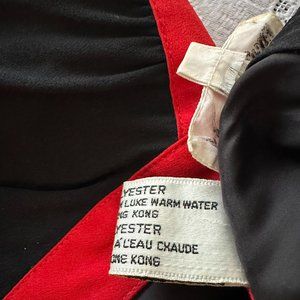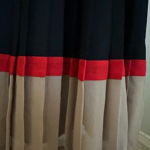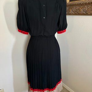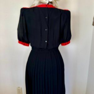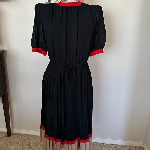 Neiman Marcus Dress, Size 6, Black Dress with Red and Taupe color trim, and enhancement, gently worn, this elegant style boasts a knife pleated skirt, elastic waist with optional tie, and is very figure flattering. This is a size six; however, it is on a (manikin with measurements of: bust of 35 1/2, waist 28 1/2, and hips 38 1/2) It fits loosely. The fabric is all polyester. It reaches just below the knee of a 5 ft 3-inch person.