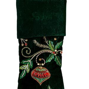 Bring elegance to your holiday décor with this Neiman Marcus Green Velvet Christmas Stocking, featuring a beautifully hand-embellished red cardinal and floral design. Crafted from luxurious dark green velvet, this 19” x 10” stocking is perfect for adding a classic and festive touch to your mantel. Brand new and beautifully detailed, it makes a wonderful holiday keepsake or gift. Spot clean only. Don’t miss out on this stunning holiday essential!