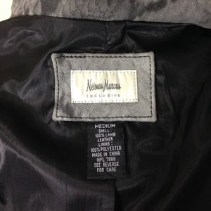 Neiman Marcus Exclusive menswear-style suede jacket with notched lapels, one button front, long sleeves with button cuffs, seamed waist, front flap pockets, and back vent. Imported! Size Medium 8-10