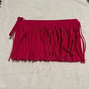 Great condition. Looks Brand new. This bag is so fun. The fring really gives it a stylis look. Measurements are 9 inches wide by 6 1/2 inches long.