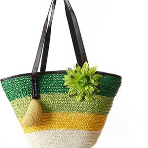 Neiman Marcus Green Straw Large Beach Tote Bag