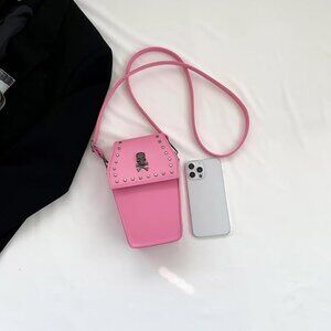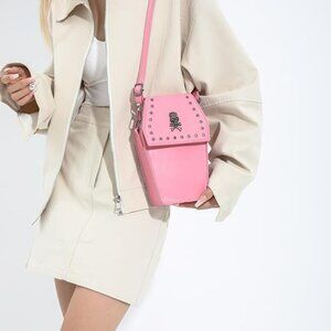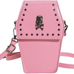 This striking coffin-shaped crossbody bag combines edgy punk fashion with dark elegance. The front features a bold skull emblem and metallic studded detailing, giving it a fierce, gothic allure that’s perfect for Halloween or alternative fashion lovers.