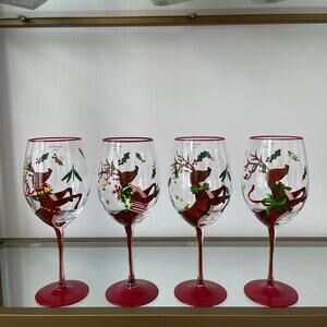 Neiman Marcus Hand-Painted Reindeer Christmas Wine Glasses Set of 4