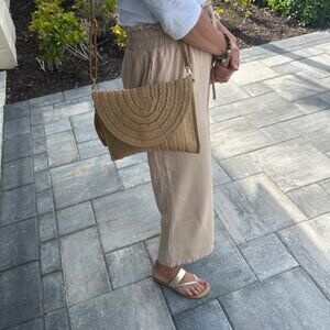 Neiman Marcus Handwoven Khaki Flap Beach Bag with Convertible Strap