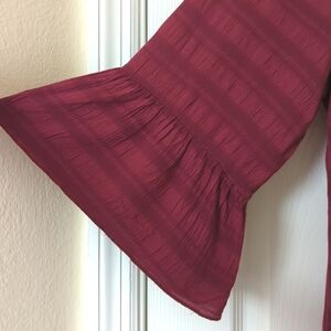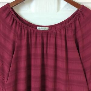 This beautiful top features an off the shoulder silhouette, quarter length bell sleeves, and a high low peplum hem. It is a berry color with horizontal jacquard stripes. It is soft, lightweight and breathable with a classic, relaxed fit. Very versatile, flattering, and high quality!