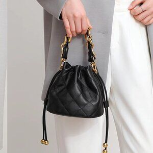 Crafted from natural quilted lambskin leather and adorned with antique gold-tone hardware, this mini bucket purse redefines sophistication in a compact silhouette. The supple texture of lambskin and its rich quilting deliver a classic, upscale feel, while versatile hardware offers multiple styling options for modern lifestyles.