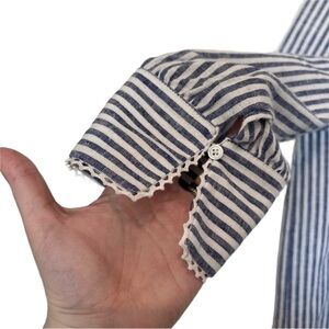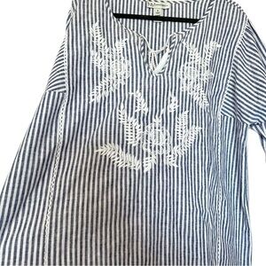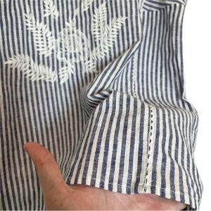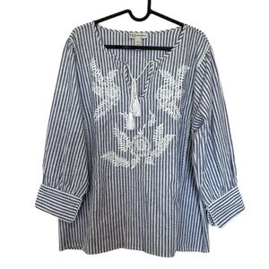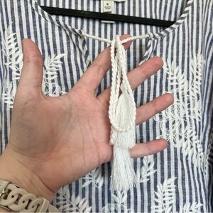 Neiman Marcus Linen Blend Striped Embroidered Tassel Tie Top Medium Resortwear