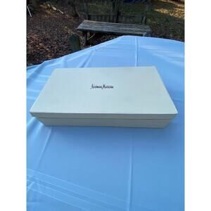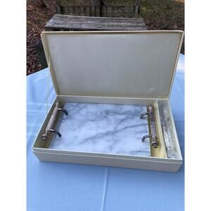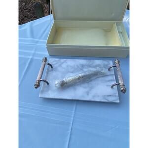 Neiman Marcus White / Gray Veining, Marble , Cheese / Charcuterie / Serving Board with Silver Handles and Knife. Estate Sale Find, in original presentation box with original price of $70. Box shows light wear from storage. Box measures 16 in X 9 in X 3 in. Weighs just over 7 lbs.Very clean, if not un-used. Excellent condition. Marble Cheese board measures approximately 8 in X 12 in (13 in including handles).