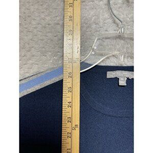 This is a Neiman Marcus men's pullover sweater in size XL, featuring a striped pattern on the sleeves in blue color. It is made of a combination of cashmere, cotton, and cotton blend materials in a knit fabric type. The sweater has long sleeves, a crew neck neckline, and is designed with a stripe sleeve detail.