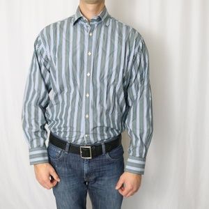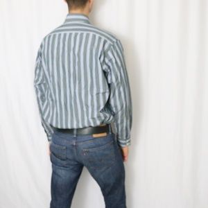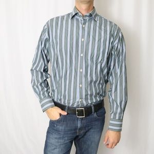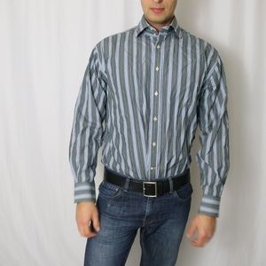 Used in good condition men's dress shirt. Pictures show signs of any wear. Only flaw that appears is that one of the buttons on the sleeve is missing as shown in picture number 5. However with all other buttons present, that button really is not needed and not noticeable. The size tag doesn't show up on this shirt but I normally wear size large with 16.5 neck and 36 arm length. Offers welcomed.