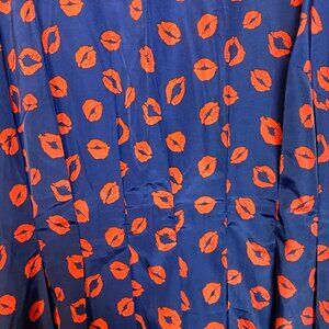 Show love in this romantic dress from Neiman Marcus that features red kiss lips printed on a solid navy blue background. This dress features short cap sleeves and a pleated bodice that flares into a pleated a-line skirt.