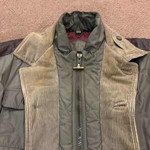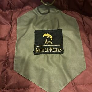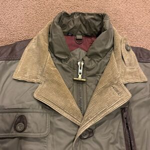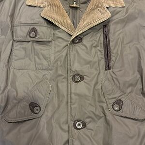 Neiman Marcus Olive Green & Brown Leather Trim and Corduroy Jacket. Zipper and button closure. Button pockets. Gently worn. 27” pit to pit and 26” shoulder to bottom hem. Size 42.