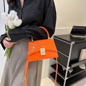 Bold yet refined, this small structured handbag is crafted from high-quality PU leather and features a timeless crocodile-embossed texture in a striking classic orange hue. With its compact silhouette and modern hardware, this versatile accessory captures both fashion-forward energy and timeless sophistication—a staple for the woman who values elevated everyday essentials.