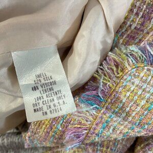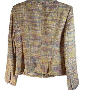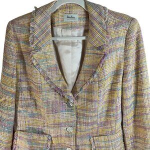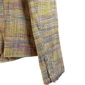 Elegant tweed blazer with subtle fringe accents. Features a pastel plaid pattern. Silver button closure and front pockets.
