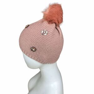 Neiman Marcus Pom Pom Beanie Hat in Pink Tan Blush with Floral Appliqués in Sequins and Rhinestones One Size Winter Embellished Beanie Hat