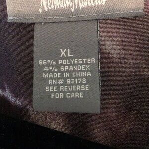 This Neiman Marcus tunic top features a stylish tie-dye pattern in purple and black, designed with a flattering V-neckline. Made from a soft polyester-spandex blend, it offers both comfort and a flowy fit. Please note small fabric pulls near the lower section, as shown in the photos.