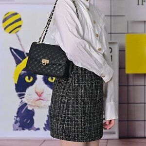 Material: Premium vegan leather with tweed detail and gold-tone chain strap