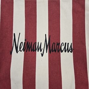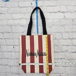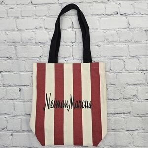 This Neiman Marcus tote bag showcases a striking red and white striped pattern, crafted from durable canvas material. Its small size makes it ideal for daily errands or casual outings, blending style with practicality.