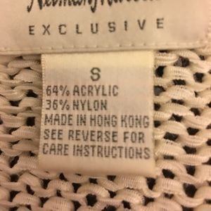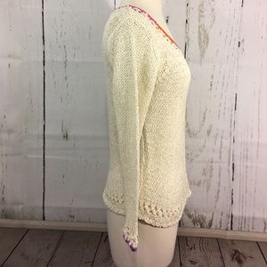This is absolutely gorgeous and NWOT. A cream colored, loose but heavy weave sweater top with crocheted beautiful different colors along the top and the edges of the sleeves Size S and made from 64% acrylic and 36% nylon, this would look beautiful with some slacks or a skirt, the possibilities are endless but the quality is unmistakable! Length measures approximately 25" and bust from pit to pit is approximately 21".