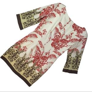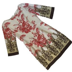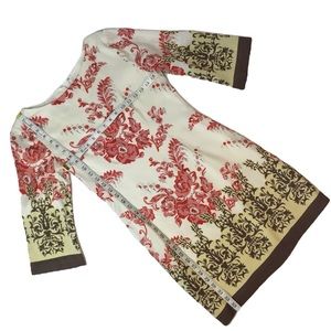 Neiman Marcus Silk Floral Motif Sheath Dress in (salmon) Red, Gold and Brown has zippered back closure and 2/3rd sleeve length. Excellent condition. Please see photos for measurements and fabric content.