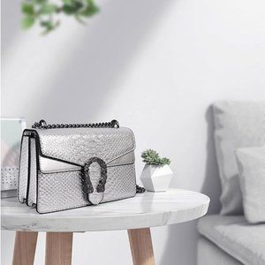 Elegant silver crossbody bag. Textured design. Chain strap detail.