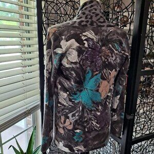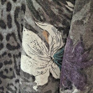 Super soft open front cardigan has a gray background with multicolor floral pattern. The shawl collar is an animal print in the same gray/black tones. A nice piece to make the focal point of your outfit or just to thrown on when it gets a bit chilly.