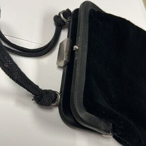 This is a beautiful Neiman Marcus Small Velvet Snap Lock Evening Bag. Soft black velvet. Silk wrapped top frame. Brushed chrome snap closure open and closes perfectly. Braided double handle with a 4” drop. Fully lined with a slip in interior pocket. 5.25” x 5” x 1. No odors. No stains. No tears.