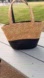 Chic woven straw tote bag in wheat and black tones, perfect for any season.