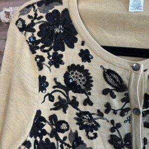Neiman Marcus Tan with Black Beaded Lace Silk Blend Cardigan Sweater Size Small
